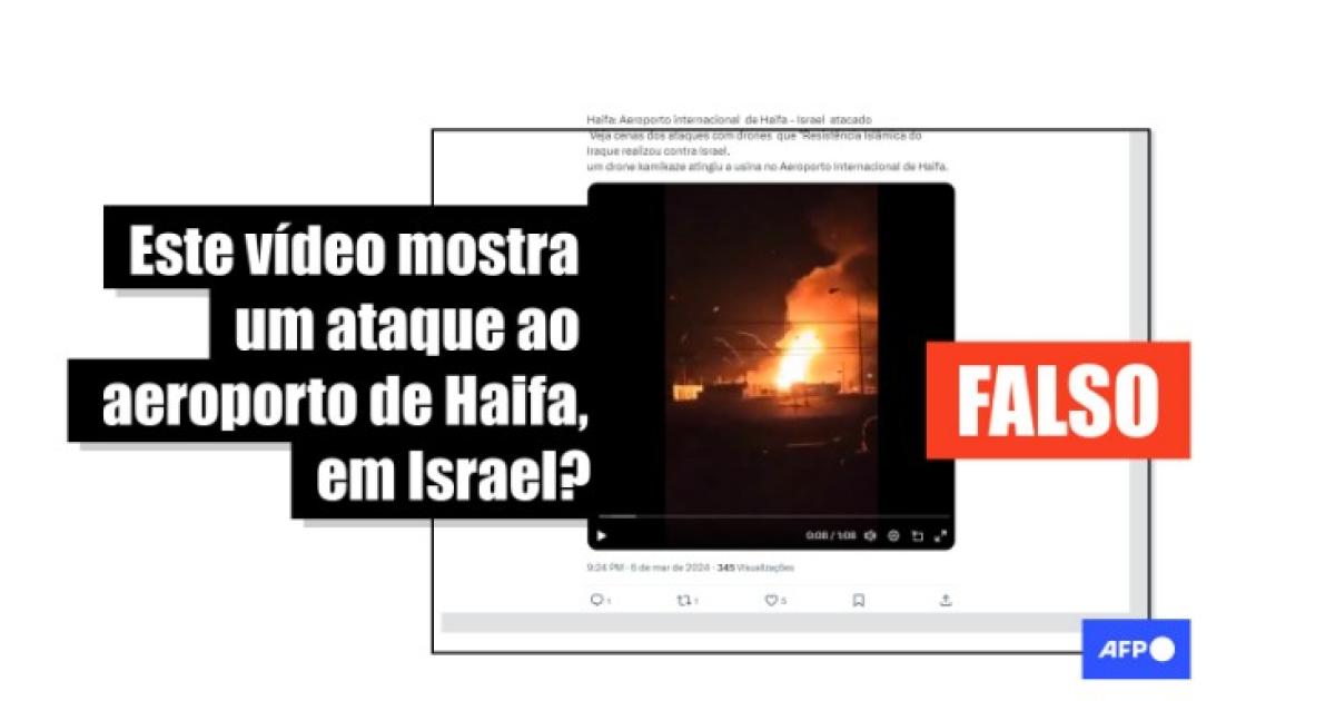 “O Grupo Xiita apoiado pelo Irã ‘Resistência Islâmica no Iraque’ disparou contra a usina de energia do Aeroporto Internacional de Haifa, com um drone kamikaze, o que resultou na explosão do tanque israelita”, diz a legenda de publicações no Facebook. O conteúdo também circula no Instagram, no Telegram, no Kwai e no X.