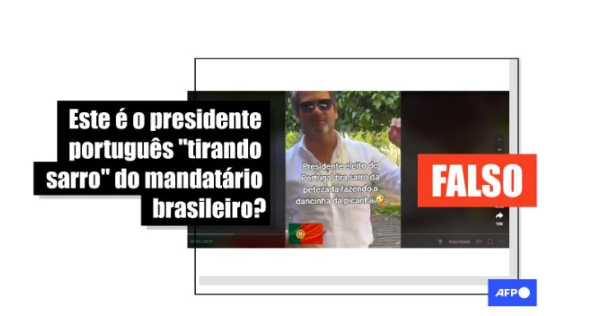 “Presidente eleito de Portugal tira sarro da petezada fazendo a dancinha da picanha”, lê-se no texto sobreposto ao vídeo que circula no Instagram, no Facebook, no Kwai, no YouTube e no TikTok.