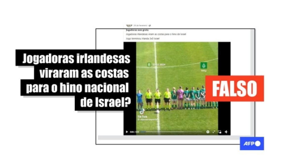 “Jogadoras irlandesas viram as costas para o hino de Israel. Jogo terminou Irlanda 3x0 Israel”, diz uma das publicações compartilhadas no Facebook, no Instagram, no X, no TikTok e no YouTube.