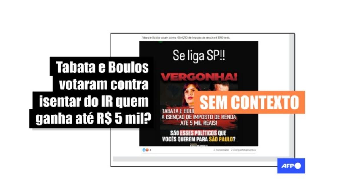 “Vergonha: Tabata e Boulos votam contra a isenção do Imposto de Renda até 5 mil reais! São esses políticos que vocês querem para São Paulo?”, questiona uma imagem que circula no Facebook. A mesma alegação é compartilhada no Instagram, no LinkedIn, no YouTube, no Kwai e no TikTok.
