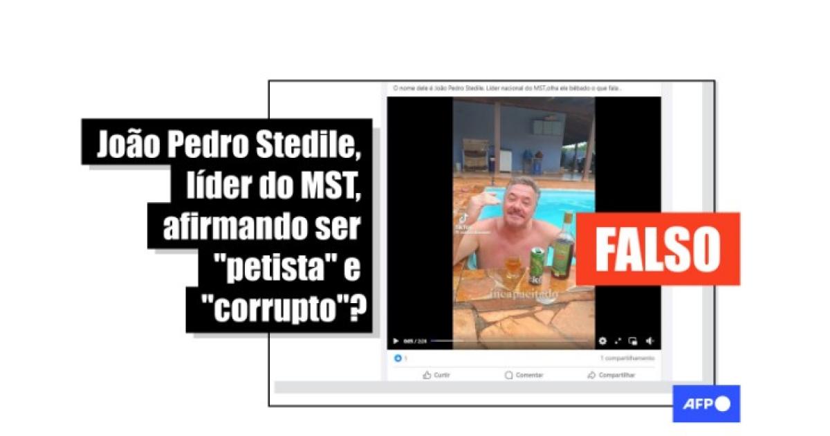 “O nome dele é João Pedro Stedile. Líder nacional do MST,olha ele bêbado o que fala”, diz uma das publicações que circulam no Facebook, no Kwai, no TikTok, no X e no Telegram.