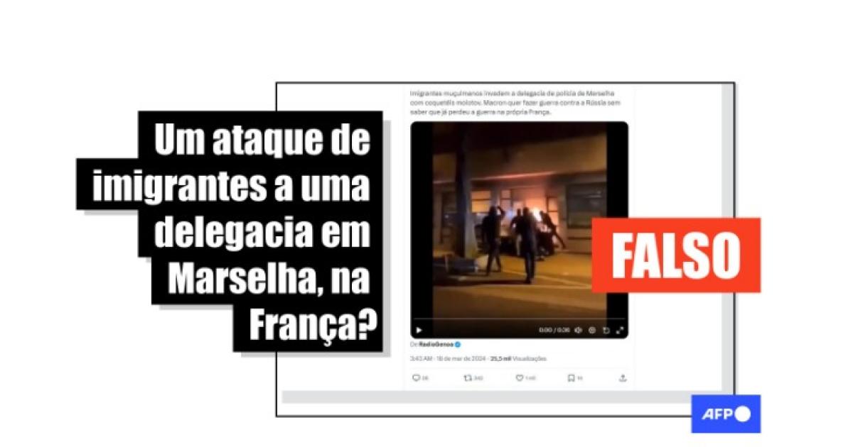 “Imigrantes muçulmanos invadem a delegacia de polícia de Marselha com coquetéis molotov. Macron quer fazer guerra contra a Rússia sem saber que já perdeu a guerra na própria França”, diz uma das publicações que compartilham o vídeo no X e no Facebook.