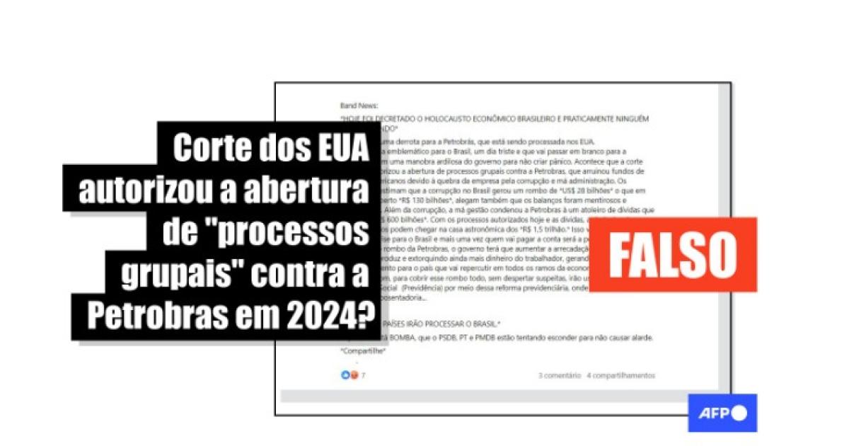 “HOJE FOI DECRETADO O HOLOCAUSTO ECONÔMICO BRASILEIRO E PRATICAMENTE NINGUÉM FICOU SABENDO (...) Acontece que a corte dos EUA autorizou a abertura de processos grupais contra a Petrobras, que arruinou fundos de pensões americanos devido à quebra da empresa pela corrupção e má administração. Os americanos estimam que a corrupção no Brasil gerou um rombo de *US$ 28 bilhões* o que em reais atinge perto *R$ 130 bilhões*”, diz uma publicação no Facebook.