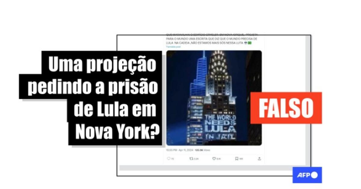 “QUE MARAVILHA! O EDIFÍCIO CRYSLER EM NOVA IORQUE, PROJETA PARA O MUNDO UMA ESCRITA QUE DIZ QUE O MUNDO PRECISA DE LULA NA CADEIA ,NÃO ESTAMOS MAIS SÓS NESSA LUTA”, diz a legenda que acompanha a foto no X, no Telegram, no Kwai, no Instagram e no Facebook.