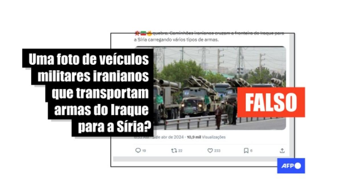 “Caminhões iranianos cruzam a fronteira do Iraque para a Síria carregando vários tipos de armas”, diz a legenda de publicações no Facebook, no Telegram e no X.