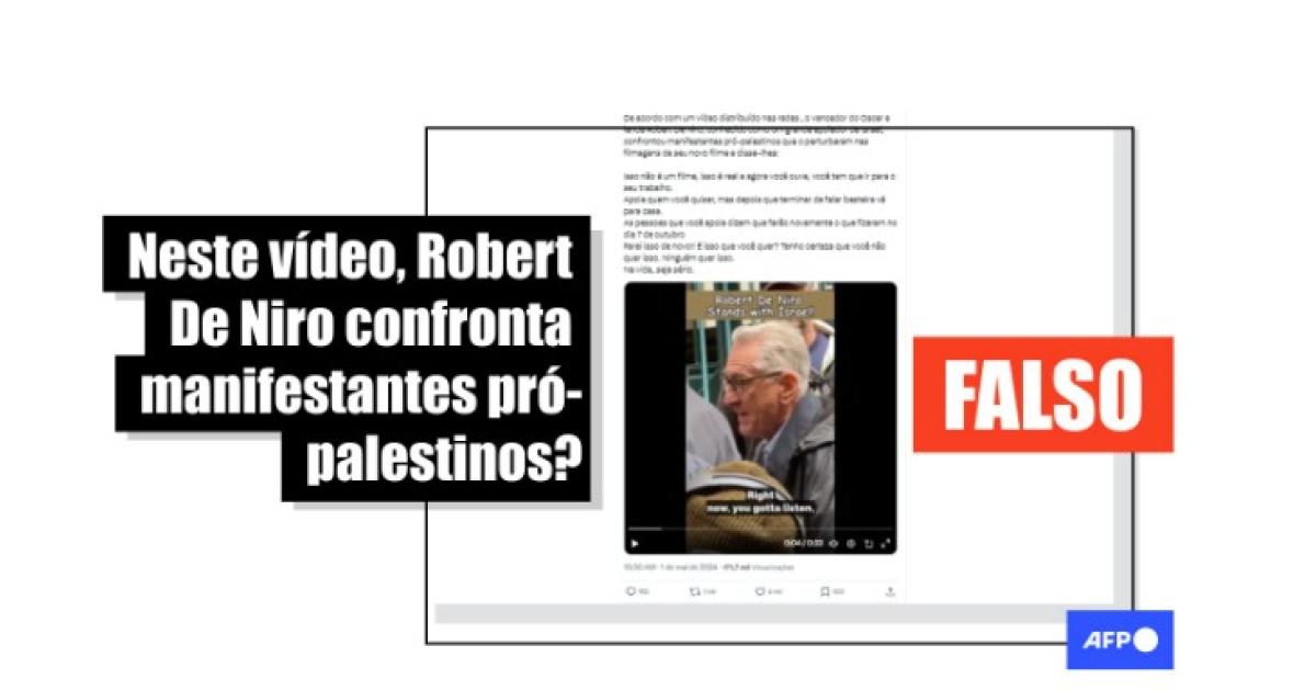 “De acordo com um vídeo distribuído nas redes, o vencedor do Oscar e lenda Robert De Niro, conhecido como um grande apoiador de Israel, confrontou manifestantes pró-palestinos que o perturbaram nas filmagens de seu novo filme”, diz a legenda de uma publicação compartilhada no X e acompanhada de um vídeo em que o ator é visto gritando em inglês: “Isso não é um filme, isso é real”.