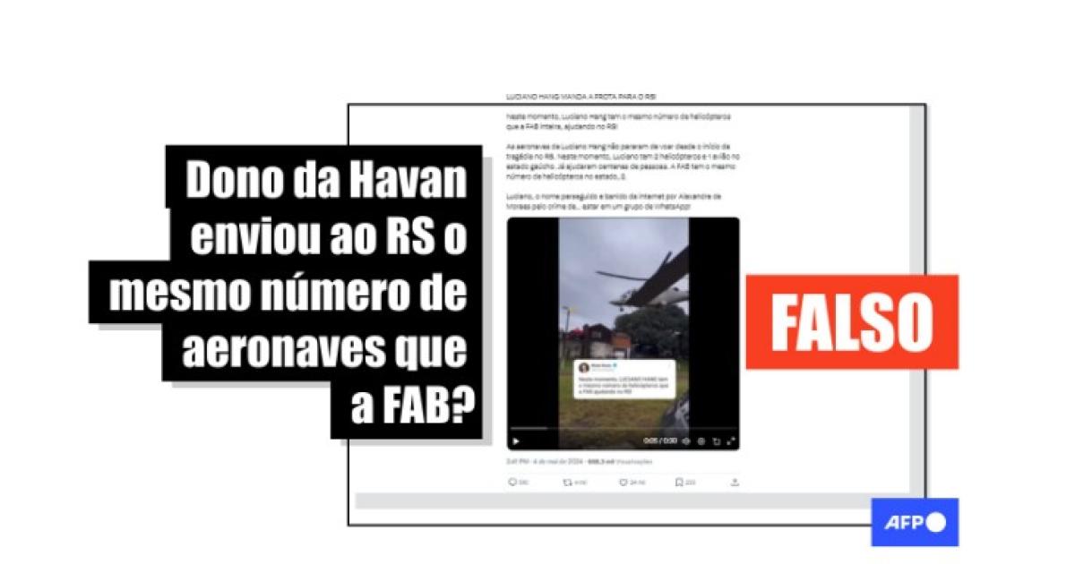 “Neste momento, Luciano Hang tem o mesmo número de helicópteros que a FAB inteira, ajudando no RS!”, afirmam publicações compartilhadas no Facebook, no Instagram, no LinkedIn, no YouTube, no TikTok, no Kwai, no Telegram e no X.