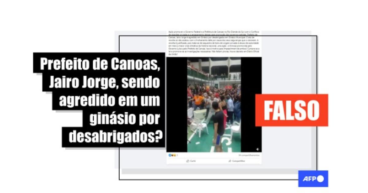 “Após promover o Governo Federal e a Prefeitura de Canoas no Rio Grande do Sul com o Confisco de doações privadas e o ensacamento dessas para promoção dos governos petistas, Prefeito de Canoas, Jairo Jorge é agredido em Ginásio por desabrigados em Ginásio Municipal (...) Não faltam provas, houve decreto em Diário Oficial da União!”, lê-se na legenda compartilhada junto com o vídeo no Instagram, no Facebook, no Kwai e no X.