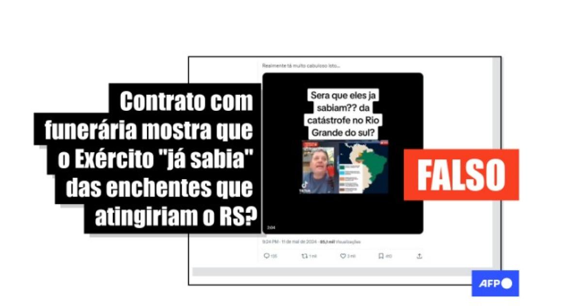 Vídeo associa falsamente contrato do Exército com serviço funerário desde 2019 a desastre no RS