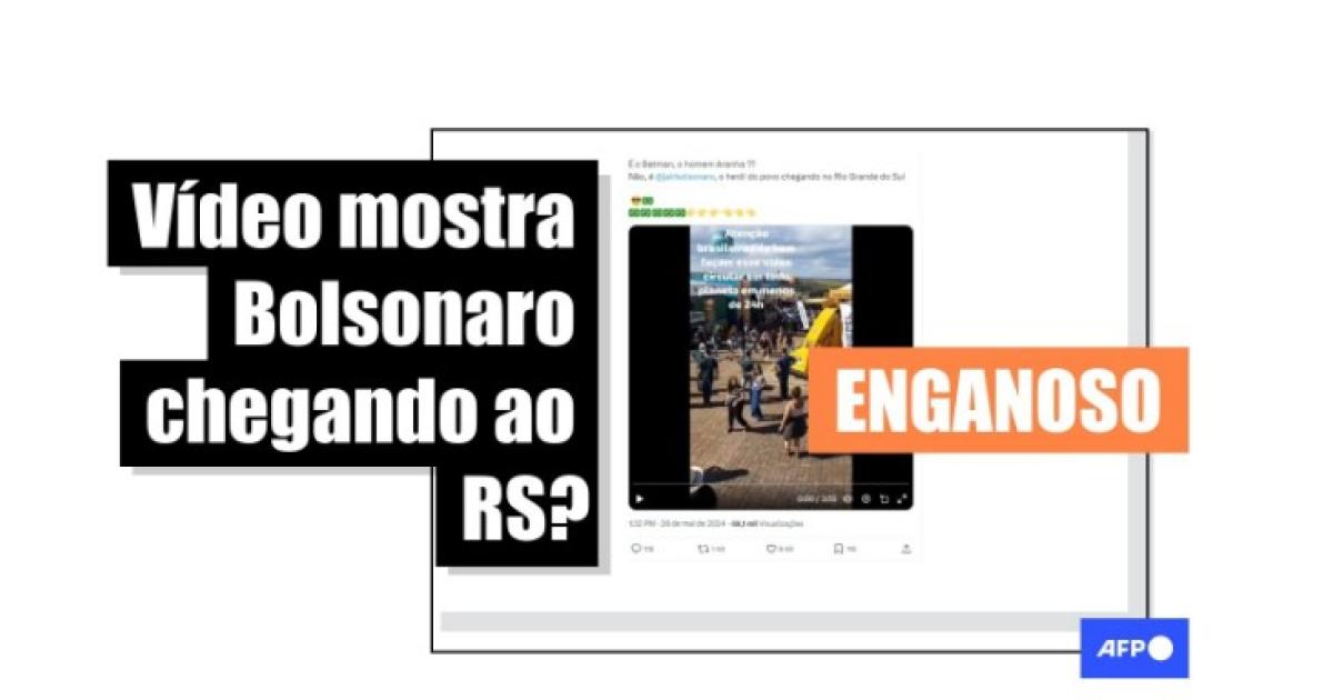 “É o Batman, o homem Aranha ?? Não, é @jairbolsonaro, o herói do povo chegando no Rio Grande do Sul”, diz um dos conteúdos compartilhados no X. O vídeo também circula no Facebook.