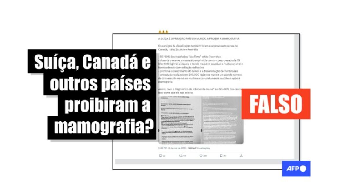 “A SUÍÇA É O PRIMEIRO PAÍS DO MUNDO A PROIBIR A MAMOGRAFIA. Os serviços de visualização também foram suspensos em partes do Canadá, Itália, Escócia e Austrália”, diz a legenda de publicações no Facebook, no Telegram e no X.