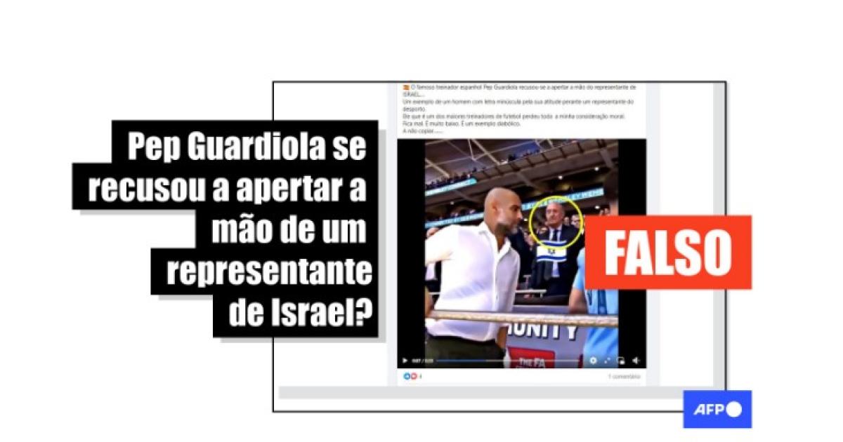 “Pep Guardiola se recusa a apertar a mão de um líder israelense!”, diz uma das publicações que circulam no Instagram, no Facebook, no X, no Telegram e no Kwai.