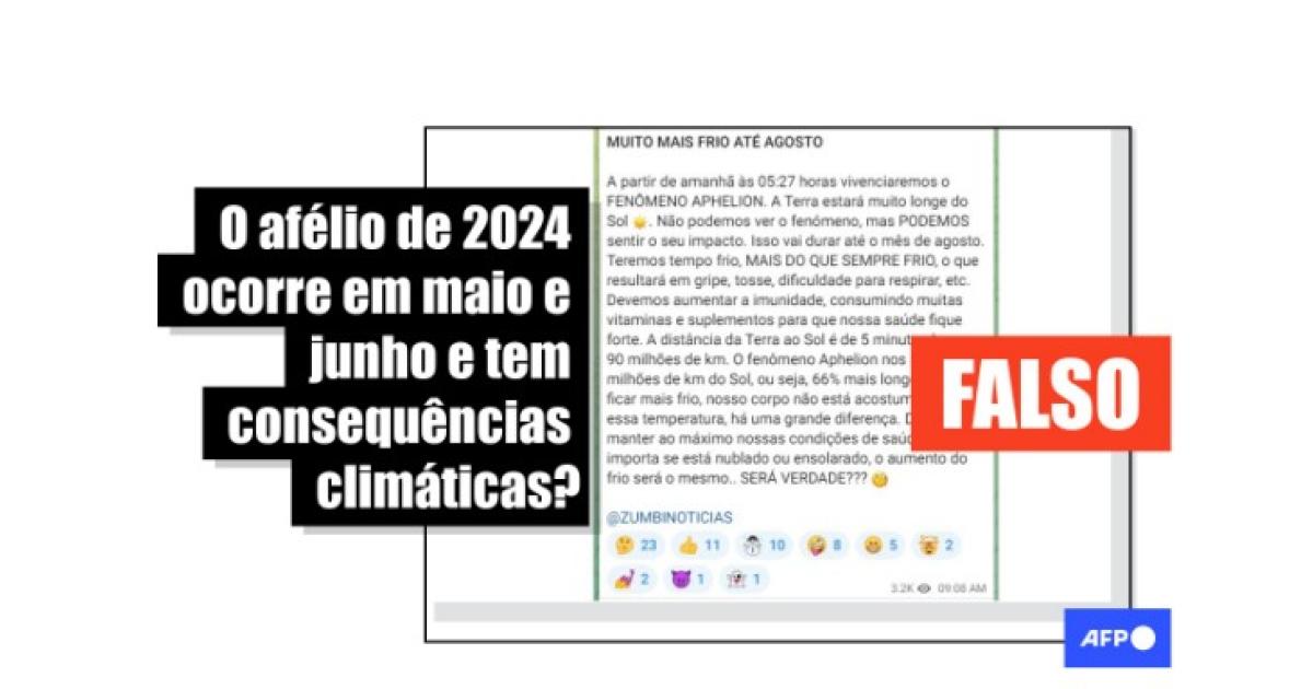 “A partir de amanhã às 05:27 horas vivenciaremos o FENÔMENO APHELION. A Terra estará muito longe do Sol. Não podemos ver o fenômeno, mas PODEMOS sentir o seu impacto. Isso vai durar até o mês de agosto. Teremos tempo frio, MAIS DO QUE SEMPRE FRIO, o que resultará em gripe, tosse, dificuldade para respirar, etc”, diz uma das publicações compartilhadas no Facebook, no Instagram, no X e no Telegram.