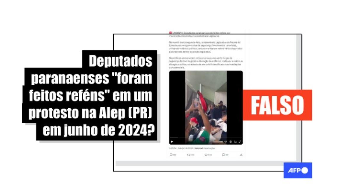 “Movimentos terroristas, utilizando violência política, cercaram e fizeram reféns vários deputados paranaenses dentro do prédio legislativo. Os políticos permanecem retidos no local, enquanto forças de segurança tentam negociar a liberação dos reféns e restaurar a ordem”, diz uma das publicações que circulam no X, no Instagram, no Facebook, no TikTok e no Kwai.