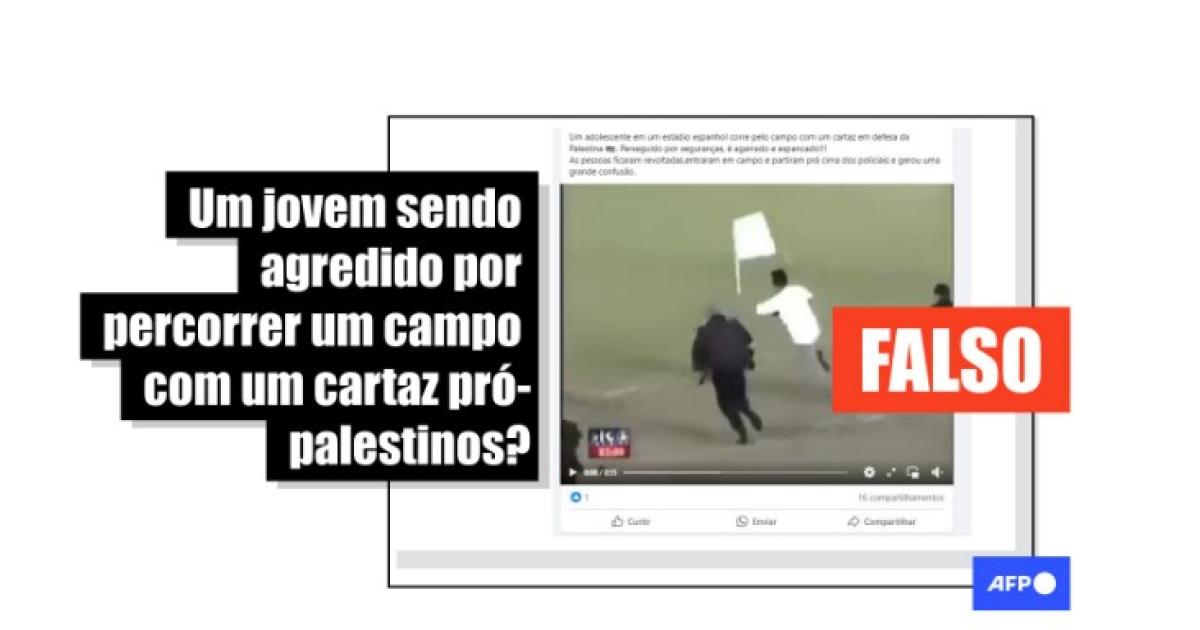 “Um adolescente em um estádio espanhol corre pelo campo com um cartaz em defesa da Palestina. Perseguido por seguranças, é agarrado e espancado!!! *A LIÇÃO FOI ÚTIL!!!* O povão agiu *muito bem* principalmente o jogador que já chegou de "bicuda na cara do cão"!*”, diz uma das publicações que compartilham o vídeo no Facebook, no Instagram e no X.