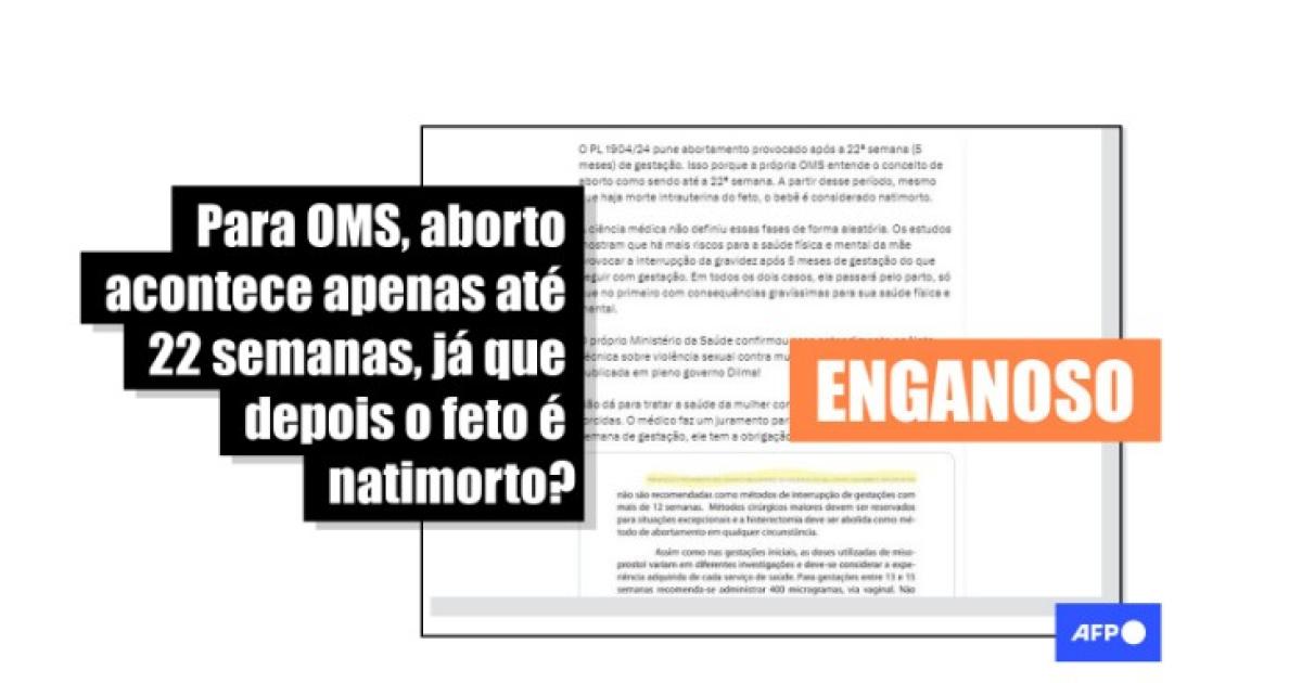 “O PL 1904/24 pune abortamento provocado após a 22ª semana (5 meses) de gestação. Isso porque a própria OMS entende o conceito de aborto como sendo até a 22ª semana. A partir desse período, mesmo que haja morte intrauterina do feto, o bebê é considerado natimorto”, diz a legenda de uma publicação que circula no Facebook e no X.