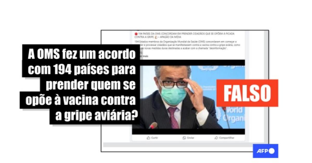 “194 PAÍSES DA OMS CONCORDAM EM PRENDER CIDADÃOS QUE SE OPÕEM À PICADA CONTRA A GRIPE – APAGÃO DA MÍDIA”, diz uma das publicações que circulam no Facebook, no X e no Telegram.