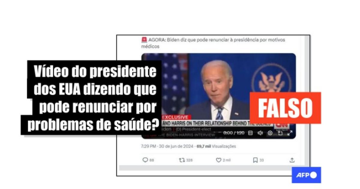 “AGORA: Biden diz que pode renunciar à presidência por motivos médicos”, diz uma das publicações que circulam no X, no Facebook, no Threads, no TikTok e no Kwai.