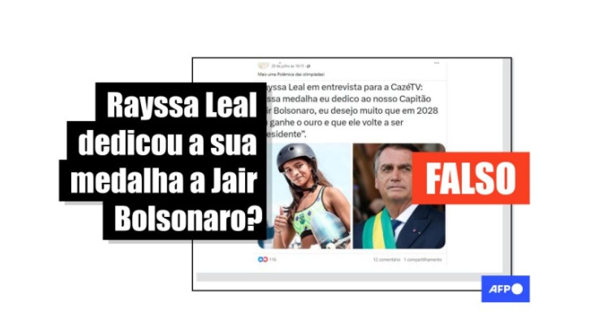 “Rayssa Leal em entrevista para a CazéTV: ‘essa medalha eu dedico ao nosso Capitão Jair Bolsonaro, eu desejo muito que em 2028 eu ganhe o ouro e que ele volte a ser presidente’”, diz uma das publicações compartilhadas no Facebook, no Instagram, no X e no TikTok.