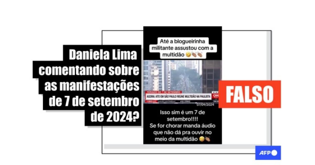 “Até a blogueirinha militante assustou com a multidão. 07/09/2024. Isso sim é um 7 de setembro!!!! Se for chorar manda áudio que não dá pra ouvir no meio da multidão”, diz o texto sobreposto a uma das publicações compartilhadas no Facebook, no Instagram, no Threads, no YouTube e no Kwai.