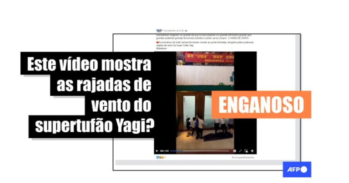 “Funcionários do hotel vietnamita tentam manter as portas fechadas, castigadas pelas fortes rajadas de vento do supertufão Yagi”, diz uma das publicações compartilhadas no Facebook, no Instagram, no Threads, no Kwai, no Bluesky e no Telegram.