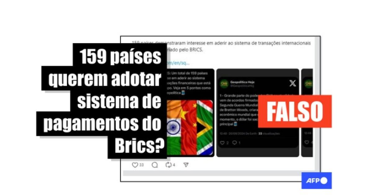 “Cerca de 160 países irão adotar o novo pagamento do Brics, chamado ‘Brics Pay’”, lê-se na publicação compartilhada no Instagram, no Facebook, no Threads, no Kwai e no Telegram.