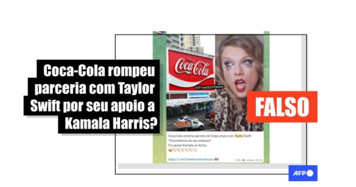 “Coca-Cola encerra parceria de longo prazo com Taylor Swift: ‘Discordamos de seu endosso’ Foi apoiar Kamala se ferrou”, diz uma publicação feita no Telegram. O conteúdo circula também no Facebook.