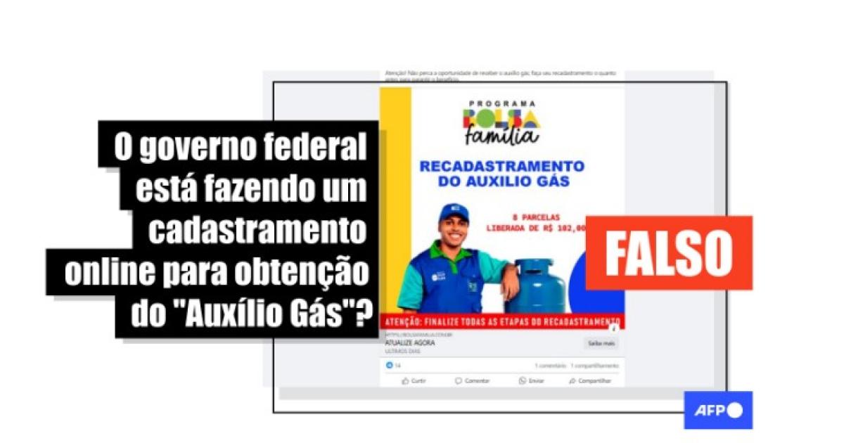 “Atenção! Não perca a oportunidade de receber o auxílio gás; faça seu recadastramento o quanto antes para garantir o benefício”, lê-se na legenda que circula com uma imagem no Facebook.