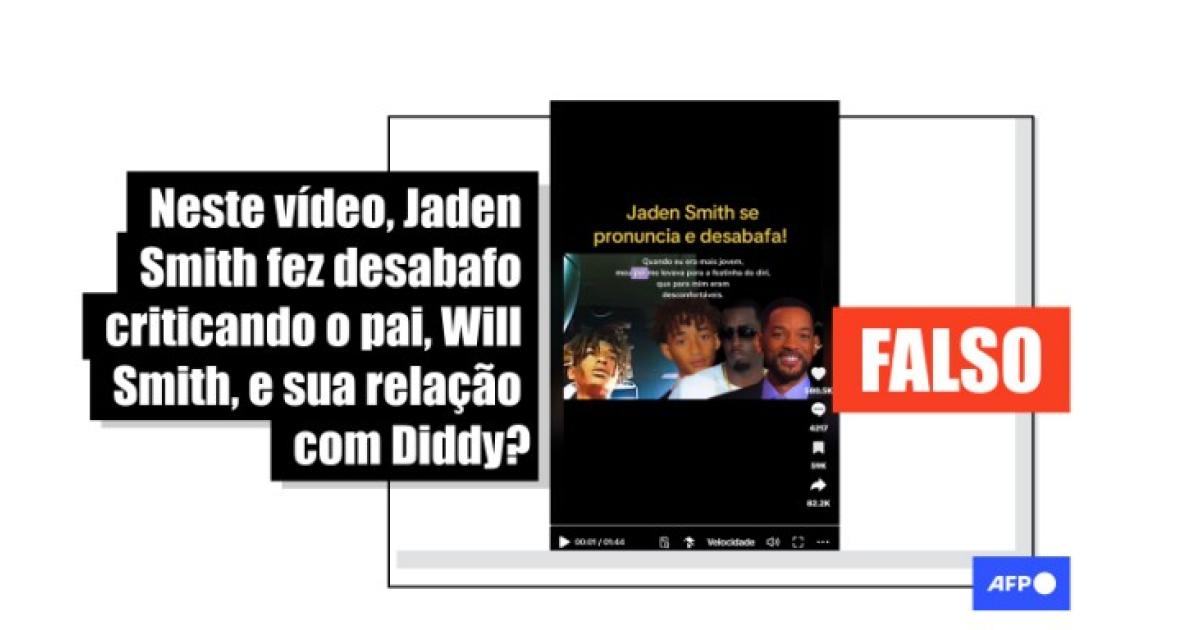 A alegação é compartilhada junto a um vídeo no qual Jaden Smith supostamente comenta a relação de Will Smith com Diddy e faz críticas ao pai, de acordo com uma dublagem em português: “Quando eu era mais jovem, meu pai me levava para as festinhas do Diddy, que, para mim, eram desconfortáveis. Toda essa experiência teve um impacto profundo no meu comportamento e na maneira como eu vejo o mundo hoje. Às vezes, é difícil ser constantemente lembrado como filho do Will, e até mesmo as músicas dele não são algo que eu aprecie tanto quanto muitos podem imaginar”.