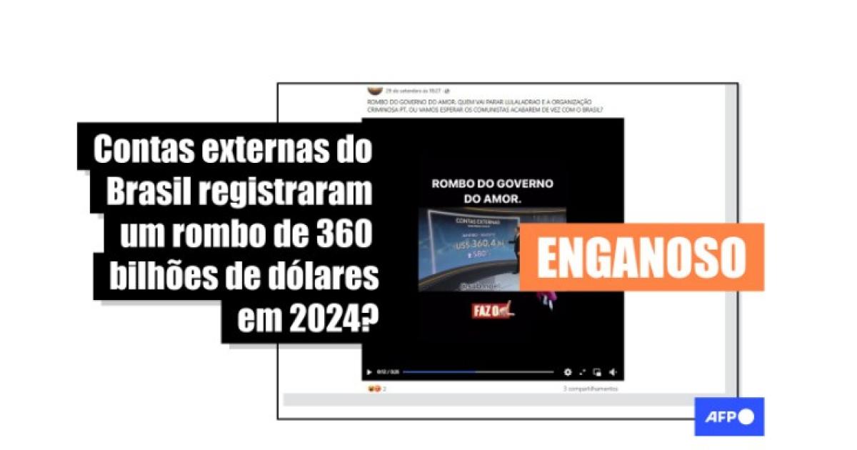 Uma pesquisa pelas palavras-chave “rombo” e “contas externas” levou a uma matéria do portal g1 de 25 de setembro de 2024. O artigo informa o mesmo valor de US$ 30,4 bilhões de déficit nas contas externas — ou transações correntes — do país, também de acordo com informações divulgadas pelo Banco Central na mesma data.