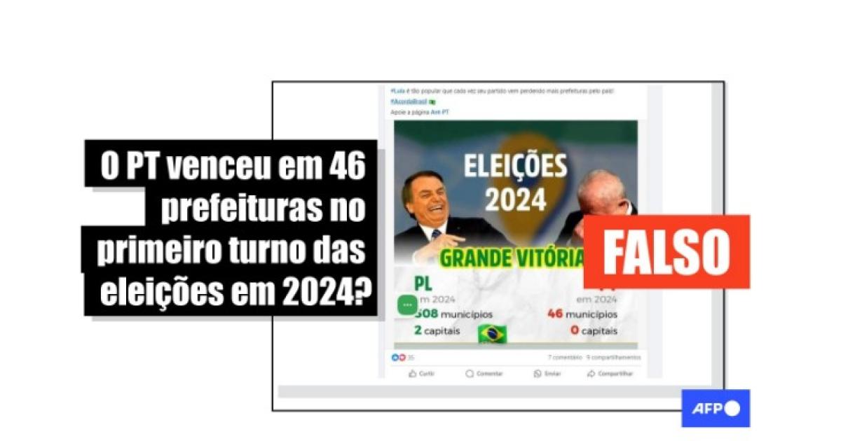 Na imagem viral, informa-se que o PL obteve vitória em 508 municípios no primeiro turno das eleições de 2024, sendo em duas capitais, enquanto o PT teria vencido em 46 municípios e em nenhuma capital do país.