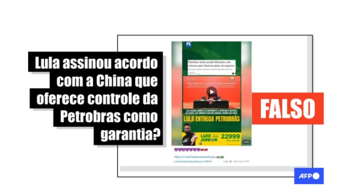 “Lula assina acordo e se compromete a entregar o controle da estatal aos chineses caso não consiga cumprir sua parte”, lê-se no texto sobreposto a um vídeo que circula no Telegram.