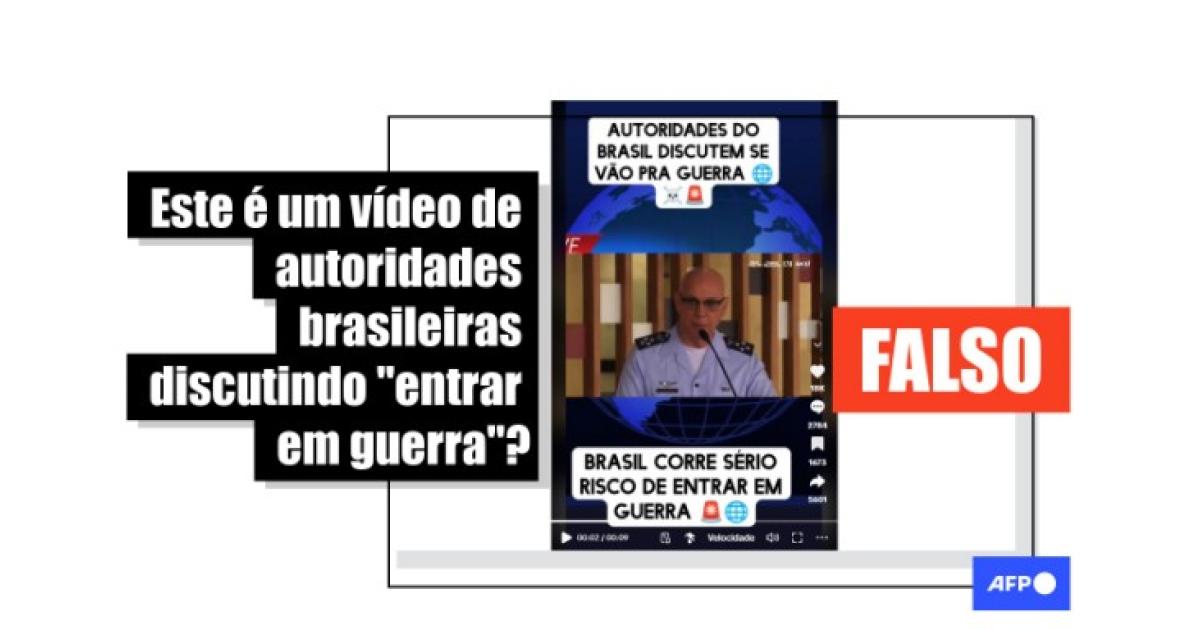 “Autoridades do Brasil discutem se vão pra guerra. Brasil corre sério risco de entrar em guerra”, é a frase sobreposta ao vídeo compartilhado no Facebook, no Kwai e no TikTok.