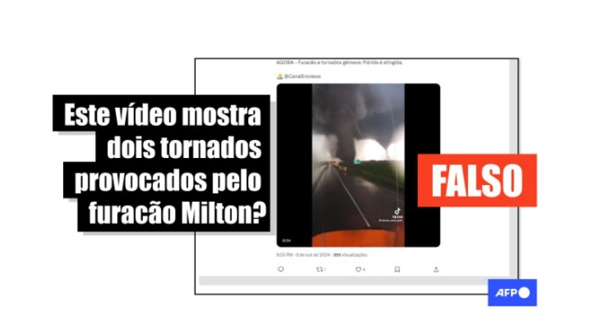 Contudo, a sequência viral de um capô de automóvel vermelho com “tornados gêmeos” ao fundo não tem relação com os eventos na Flórida em 2024.