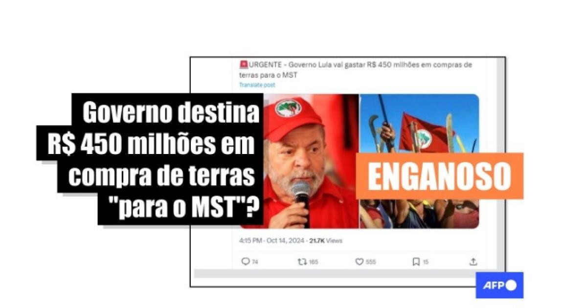 “Governo Lula vai gastar R$ 450 milhões em compras de terra para o MST”, diz uma mensagem compartilhada no X. O conteúdo também circula no Facebook, no Instagram, no TikTok e no Kwai.
