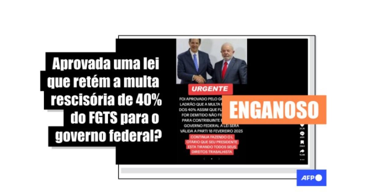 “URGENTE FOI APROVADO PELO GOVERNO DO LADRÃO QUE A MULTA RESCISÓRIA DOS 40% ASSIM QUE FUNCIONÁRIO FOR DEMITIDO NÃO FICARÁ MAIS PARA CONTRIBUINTE E SIM PARA GOVERNO FEDERAL A LEI SERA VÁLIDA A PARTI 18 DE FEVEREIRO 2025”, lê-se na mensagem que circula com uma imagem do ministro da Fazenda, Fernando Haddad, ao lado do presidente Luiz Inácio Lula da Silva (PT) no Facebook, no Instagram, no TikTok e no Kwai.