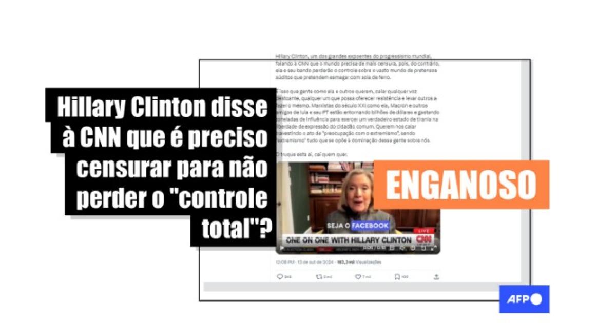 “Hillary Clinton, um dos grandes expoentes do progressismo mundial, falando à CNN que o mundo precisa de mais censura, pois, do contrário, ela e seu bando perderão o controle sobre o vasto mundo de pretensos súditos que pretendem esmagar com sola de ferro”, diz a legenda de publicações compartilhadas no Telegram pelo ex-presidente Jair Bolsonaro (PL), e no Facebook e no X por seu filho e vereador pelo Rio de Janeiro, Carlos Bolsonaro (PL).