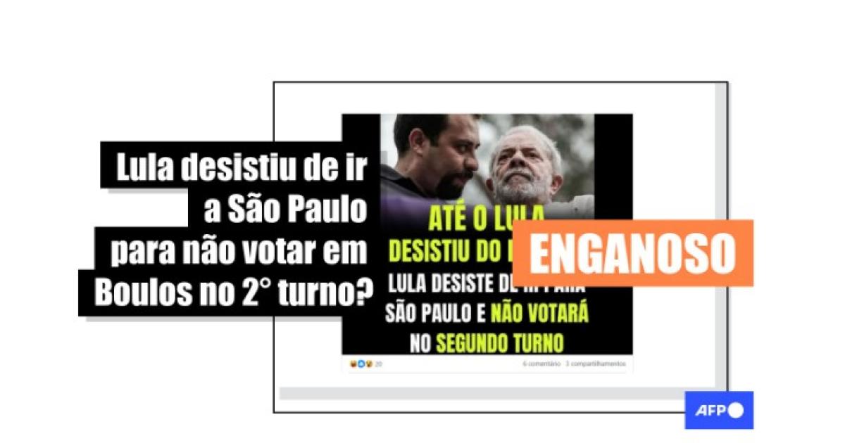 O conteúdo é ilustrado por uma foto do presidente ao lado de Boulos. Na parte inferior da imagem, compartilhada no Facebook, no Instagram, no X e no Kwai, lê-se: “ATÉ O LULA DESISTIU DO BOULOS!. LULA DESISTE DE IR PARA SÃO PAULO E NÃO VOTARÁ NO SEGUNDO TURNO”.