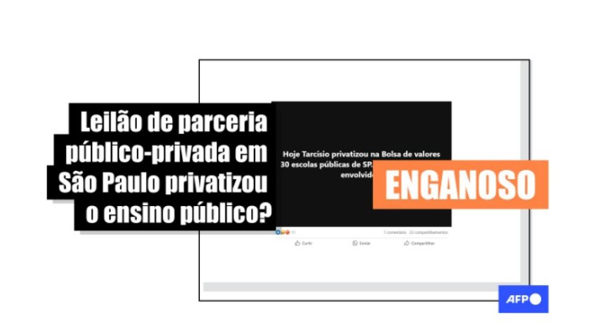 “Hoje Tarcísio privatizou na Bolsa de Valores 30 escolas públicas de SP”, diz uma das publicações compartilhadas no Facebook. Alegações semelhantes sobre a privatização do ensino público circulam no Instagram e no Kwai.