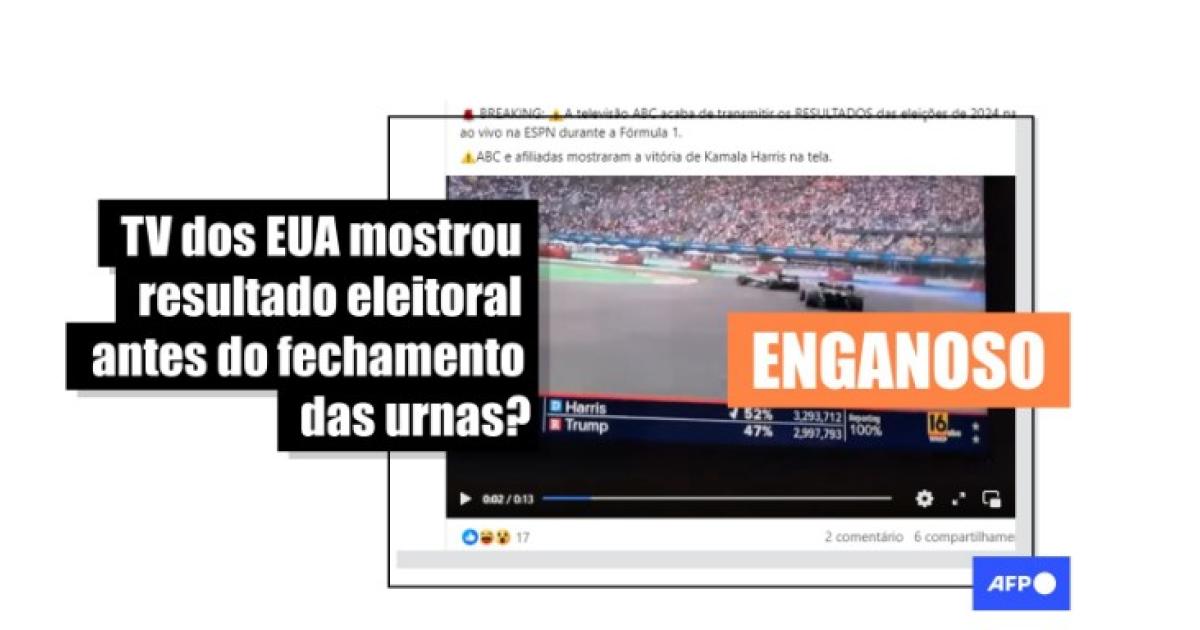 “A televisão ABC acaba de transmitir os RESULTADOS das eleições de 2024 na TV ao vivo na ESPN durante a Fórmula 1. ABC e afiliadas mostraram a vitória de Kamala Harris na tela”, diz uma das publicações compartilhadas no Facebook, no Instagram, no X, no TikTok, no Threads e no Telegram.
