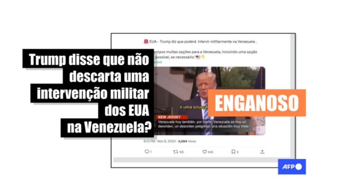“URGENTE: Donald Trump afirma que poderá haver intervenção militar na Venezuela . ‘Nós tempos muitas opções para a Venezuela, incluindo uma opção militar possível, se necessário’”, lê-se na legenda de um vídeo que circula no Instagram, no Facebook, no TikTok, no X e no Telegram.