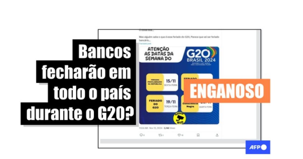 “A FEBRABAN acatou os feriados do G20, os bancos fecharão dia 14 e só reabrirá as portas dia 21.11.2024*.*Quem tem tributos, estadual/ federal para pagar, tem que antecipar o pagto para dia 14”, diz a legenda que circula com uma imagem no X, no Instagram, no Facebook e no Threads.