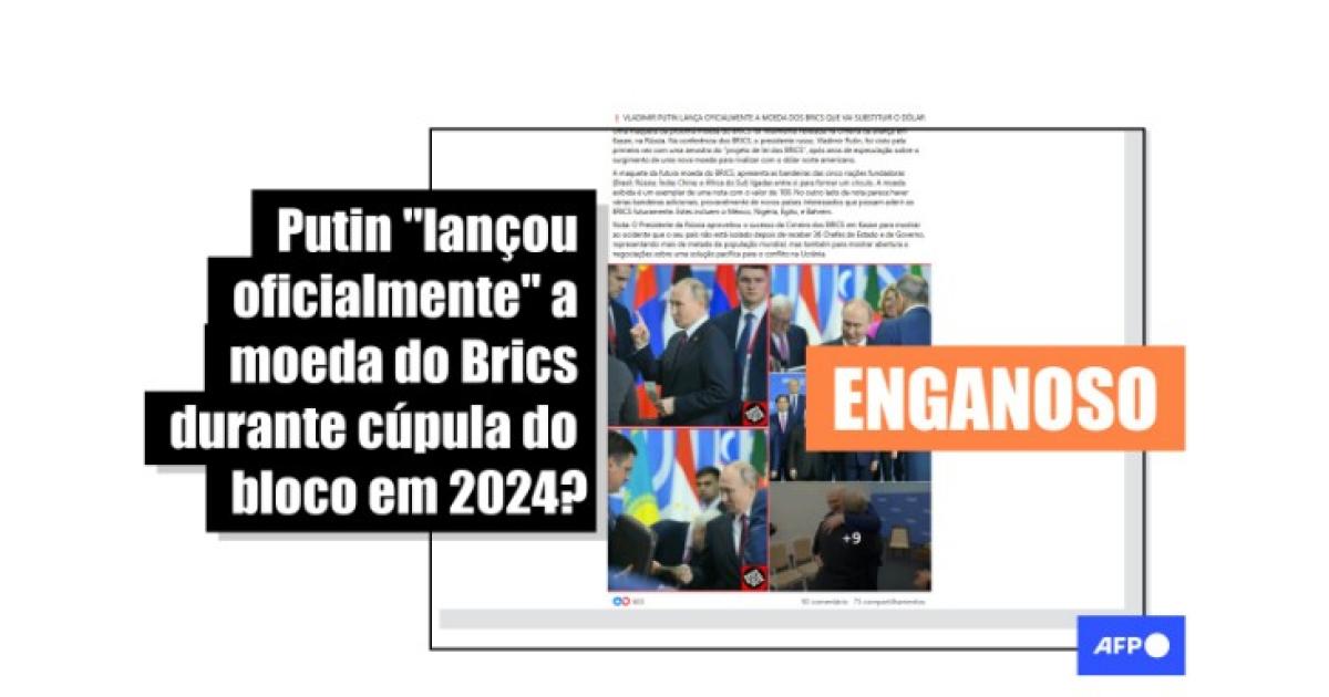 No entanto, a alegação de que Putin teria apresentado “oficialmente a moeda dos Brics que vai substituir o dólar” durante o encontro é enganosa.