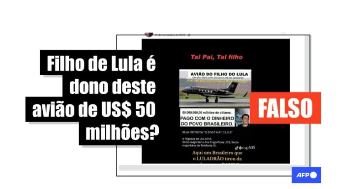 No conteúdo viral, os dizeres sobre um dos aviões “mais caros” da sua categoria e o “filho do Lula” estão sobrepostos a uma imagem de uma aeronave preta com detalhes em branco e uma fotografia de um dos filhos do presidente, Fábio Luís Lula da Silva.