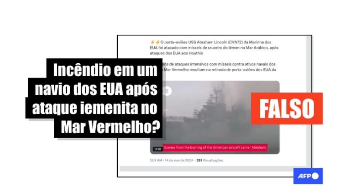 “O porta-aviões USS Abraham Lincoln (CVN72) da Marinha dos EUA foi atacado com mísseis de cruzeiro do Iêmen no Mar Arábico, após ataques dos EUA aos Houthis + Imagens de ataques intensivos com mísseis contra ativos navais dos EUA no Mar Vermelho resultam na retirada de porta-aviões dos EUA da região”, diz uma das publicações compartilhadas no Facebook, no X e no Telegram.