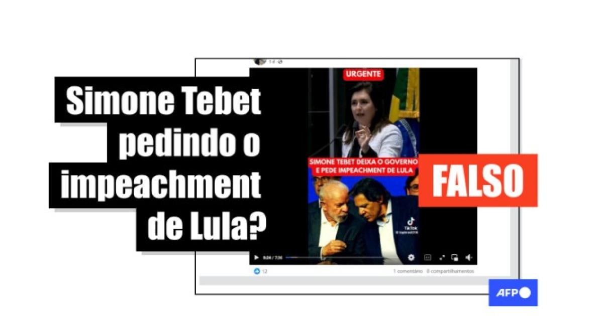 “Urgente: Simone Tebet deixa o governo e pede impeachment de Lula”, diz o texto sobreposto ao vídeo compartilhado no Facebook, no Instagram, no TikTok, no X, no YouTube e no Kwai.