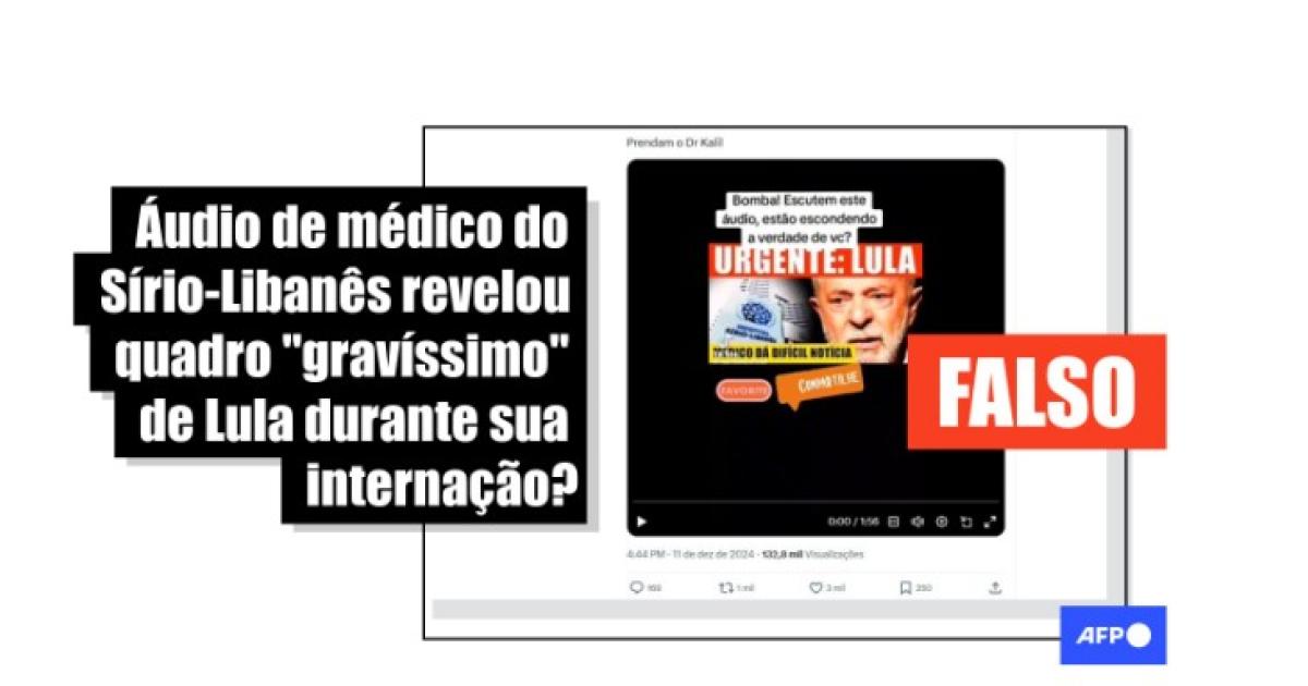 “Lula e sua internação, o que estão escondendo de nós?”, diz uma das publicações que compartilham a gravação no Facebook, no Instagram e no X. Sobreposta à gravação, lê-se a mensagem: “Bomba! Escutem este áudio, estão escondendo a verdade de vc? Urgente: Lula. médico dá difícil notícia”.