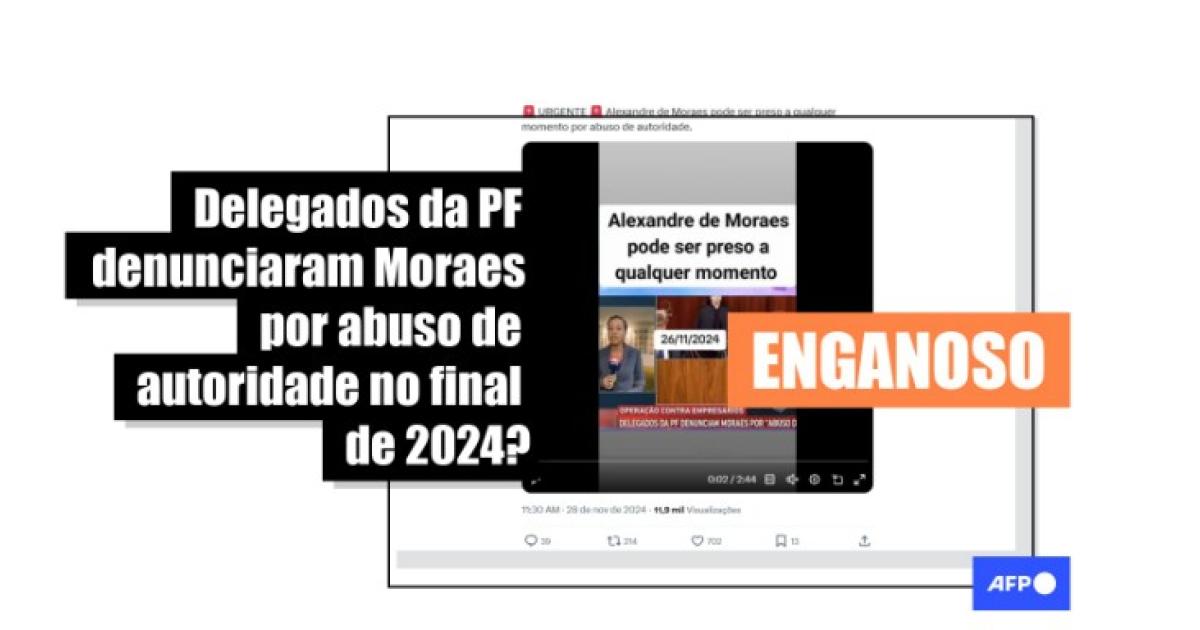 No vídeo, de pouco mais de dois minutos, uma jornalista com um microfone da Jovem Pan noticia que um grupo de delegados aposentados da PF protocolou uma notícia-crime contra o ministro Alexandre de Moraes e o delegado da Diretoria de Inteligência da PF Fábio Alvarez. “O que eles alegam? Abuso de autoridade por parte dos dois naquela ação que investigou os oito empresários ligados ao presidente Jair Bolsonaro”, diz.