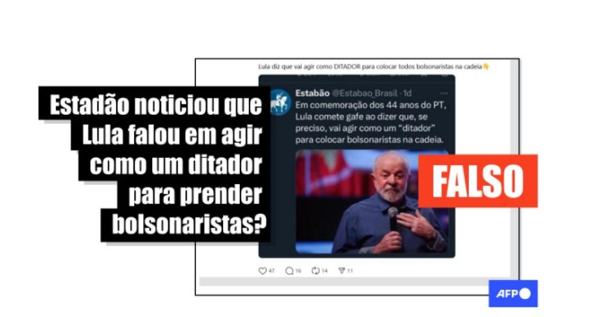 Na imagem que acompanha as publicações, uma foto do presidente Lula ilustra o que parece ser uma manchete: “Em comemoração dos 44 anos do PT, Lula comete gafe ao dizer que, se preciso, vai agir como um ‘ditador’ para colocar bolsonaristas na cadeia”.