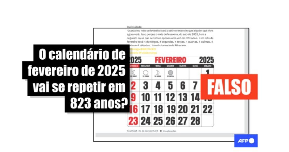 O período de repetição do calendário de fevereiro de 2025 pode ser um pouco maior se considerarmos apenas as ocasiões em que o mês começa e termina no mesmo dia da semana. Mesmo assim, diferentemente do que afirmam as publicações virais, o intervalo não é de 823 anos.